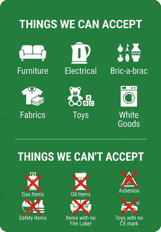 The image shows the items we can or cannot accept. This is not a exhaustive list. Please call us should you need any advice.