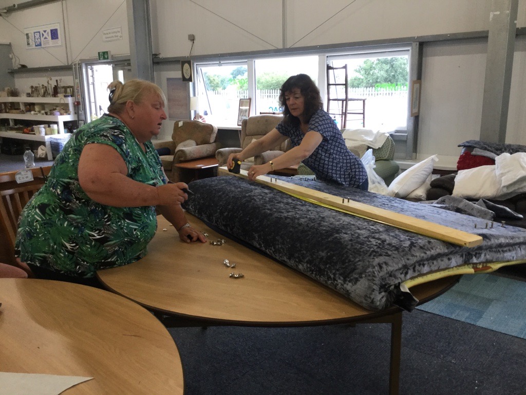 Gail & Mary run their own business called Finishing Touches and offered to do a workshop for us to show people how easy and cost effective it is to change the colour and/or purpose of items to fit in with their household. The ladies pre-select an item to use and order the fabric ahead of time. Workshop attendees are hands on from the start, helping to strip the item back to the bare bones. They are then shown how to use the old fabric as a template for the new covering and then how to secure it. The off cuts of the fabric are then turned into scatter cushions ensuring there is no waste. The items are then available to buy in our showroom.